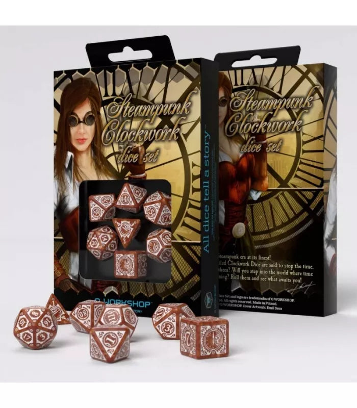 Dados Steampunk Clockwork en Caramelo y Blanco (7 unidades) - Q Workshop. Tic-tac, tic-tac... El reloj avanza y te estás quedando sin tiempo. ¿Qué vas a hacer? ¿Un paso adelante o atrás? ¿O quizás te detienes a pensar? No importa, porque el tiempo aún puede alcanzarte... ¿O no? ¡Usa nuestros nuevos dados Steampunk Clockwork y descubre que el tiempo se puede detener!